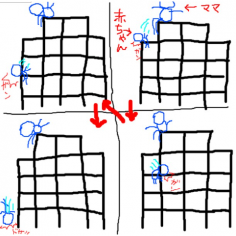 赤ちゃん抱いたお母さん(多分)がジャングルジムの天辺に上って